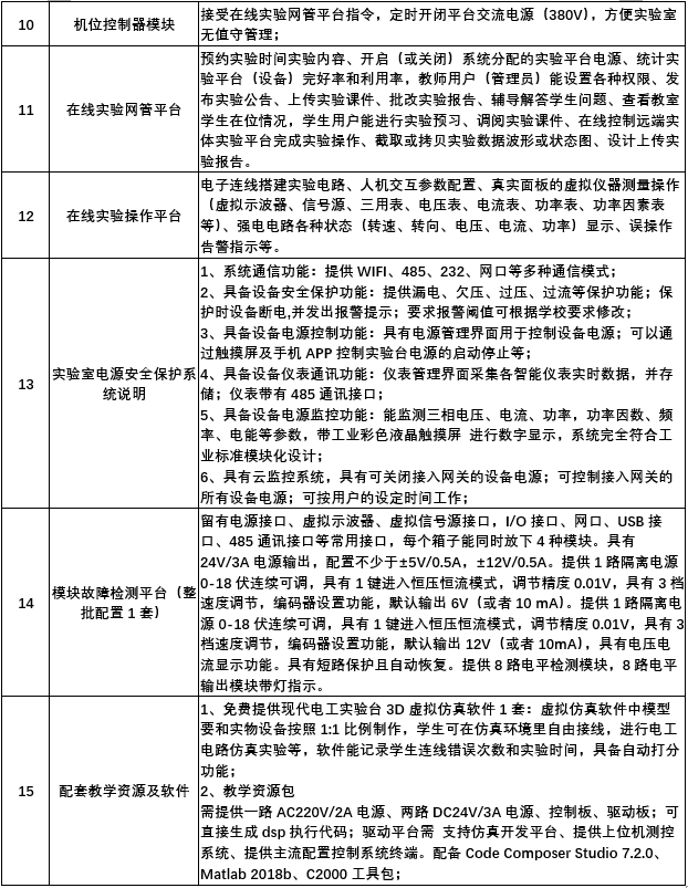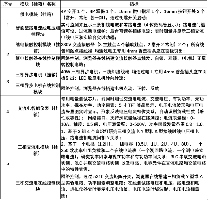 3、輸入電源:三相四線(或三相五線)380V±5% 50Hz,上限電流不超過16A。工作環(huán)境:溫度-10℃~+40℃ 相對濕度<85%(25℃) 海拔<4000m。總功率不小于500W。滿足國標的漏電保護要求,具有過載、過流、漏電保護措施。標配智能型線電流測控模塊,實時監(jiān)測并顯示三條相線電流和零線電流,可供學生研究線電流相電流關系;可根據(jù)實驗內容隨時設置線電流門檻值,確保過流保護響應速度;