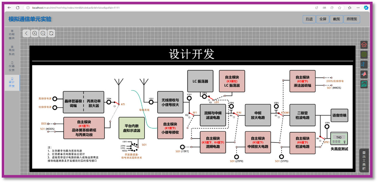 4、自主設(shè)計電路(算法)可替換平臺內(nèi)通信系統(tǒng)中單元電路,在場景中評測設(shè)計電路性能,提升學(xué)習(xí)興趣;