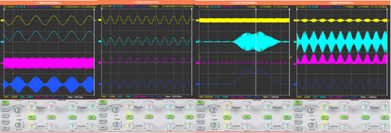 每個(gè)展示屏分三個(gè)區(qū)域,上半部分為實(shí)測節(jié)點(diǎn)波形,中間部分為4通道示波器功能旋鈕(靈敏度、掃速、觸發(fā)方式、位移、工作模式等),下半部分為單元電路框圖;示波器操作旋鈕、框圖切換開關(guān)、電路參數(shù)調(diào)整旋鈕等均能觸摸控制;