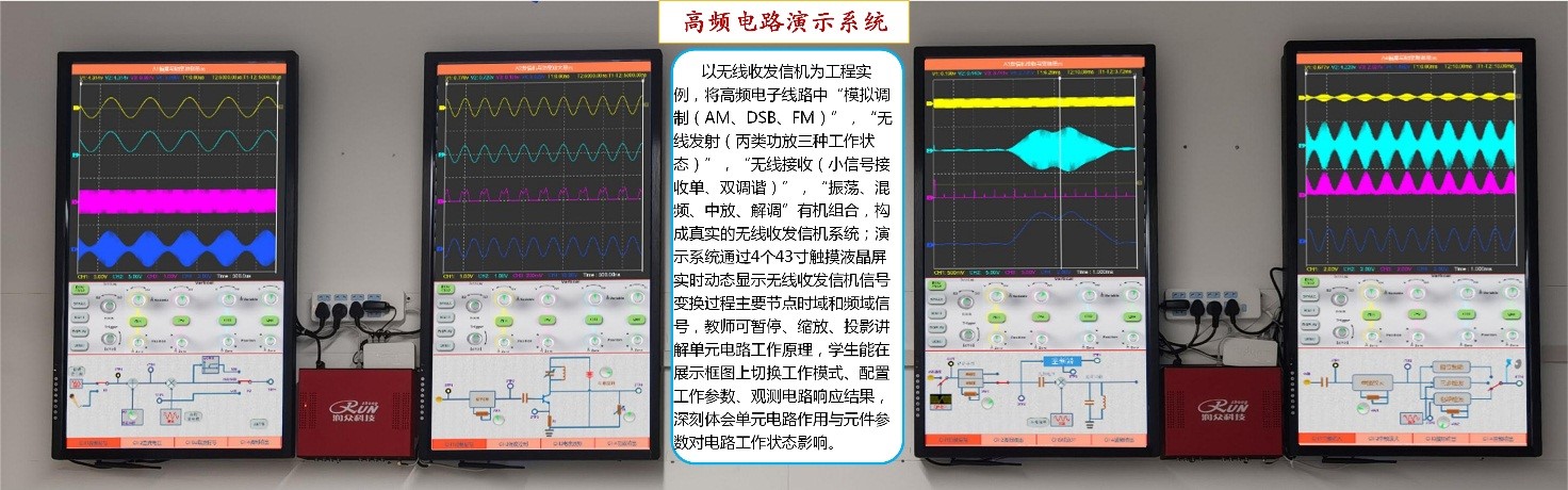 以無線收發(fā)信機(jī)為工程實(shí)例,將高頻電子線路中“模擬調(diào)制(AM、DSB、FM)”,“無線發(fā)射(丙類功放三種工作狀態(tài))”,“無線接收(小信號(hào)接收單、雙調(diào)諧)”,“振蕩、混頻、中放、解調(diào)”有機(jī)組合,構(gòu)成真實(shí)的無線收發(fā)信機(jī)系統(tǒng);演示系統(tǒng)通過4個(gè)43寸觸摸液晶屏實(shí)時(shí)動(dòng)態(tài)顯示無線收發(fā)信機(jī)信號(hào)變換過程主要節(jié)點(diǎn)時(shí)域和頻域信號(hào),教師可暫停、縮放、投影講解單元電路工作原理,學(xué)生能在展示框圖上切換工作模式、配置工作參數(shù)、觀測電路響應(yīng)結(jié)果,深刻體會(huì)單元電路作用與元件參數(shù)對(duì)電路工作狀態(tài)影響。