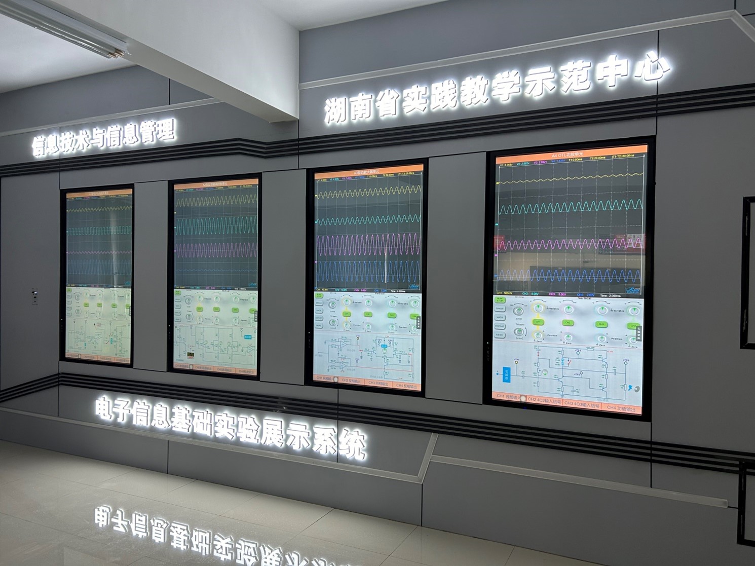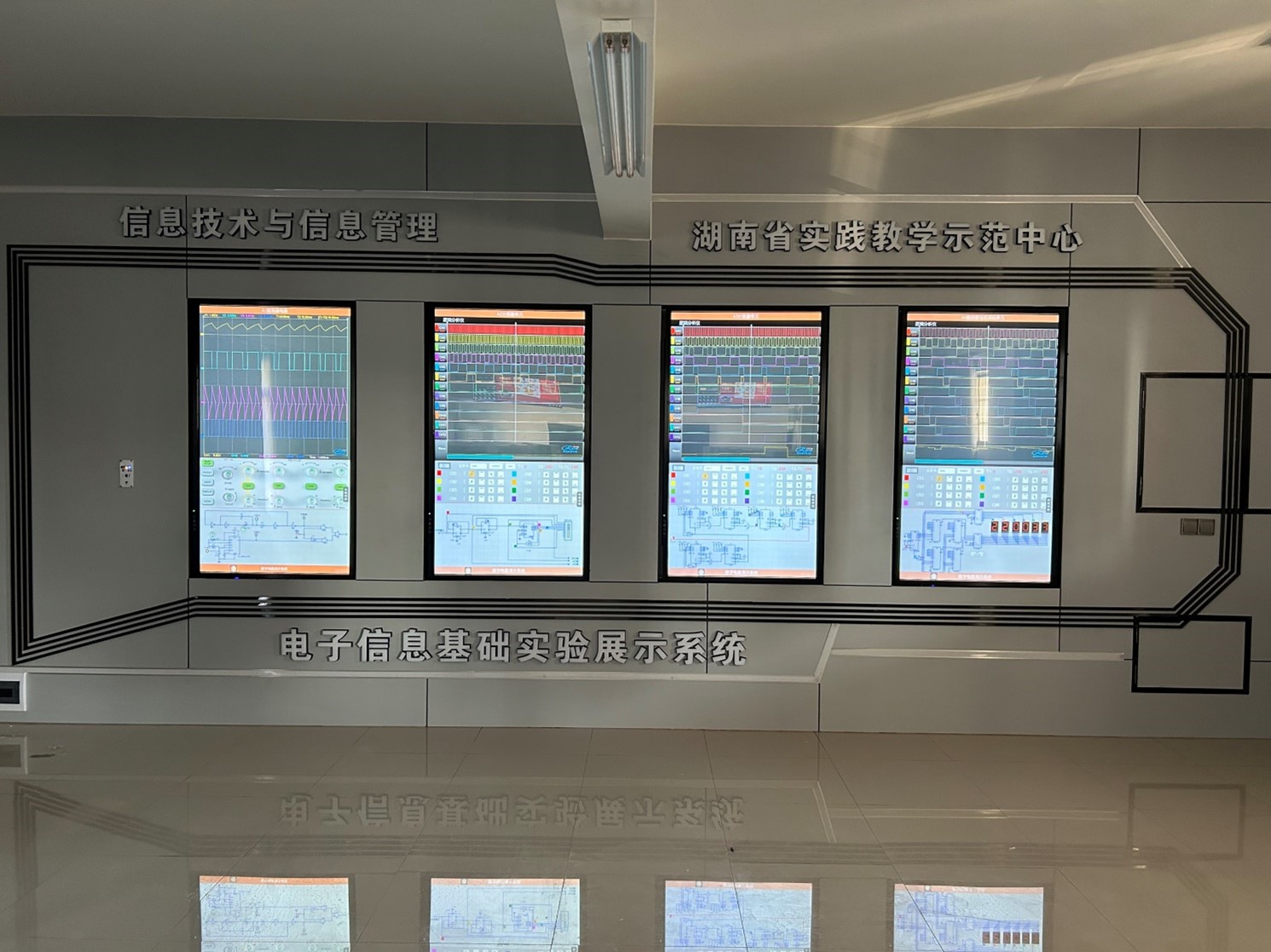 電子信息基礎(chǔ)演示系統(tǒng)以數(shù)電的“數(shù)字鐘”和模電的“音響“為工程實(shí)例,4個(gè)65寸觸摸屏實(shí)時(shí)動態(tài)顯示過程各單元主要節(jié)點(diǎn)信號波形;既可以作為實(shí)驗(yàn)室文化建設(shè),也可以作為教學(xué)設(shè)備使用。老師能夠投影講解單元電路工作原理,學(xué)生能在展示框圖上切換工作模式、配置工作參數(shù)、觀測電路響應(yīng)結(jié)果,提升學(xué)習(xí)興趣。