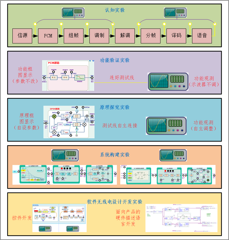數(shù)字化通信技術(shù)綜合實(shí)訓(xùn)平臺(tái)內(nèi)嵌實(shí)驗(yàn)所需測(cè)試儀器、實(shí)驗(yàn)?zāi)K、射頻前端、工控PC機(jī);學(xué)生可以線上線下、隨時(shí)隨地不受時(shí)空限制進(jìn)行系統(tǒng)認(rèn)知、功能驗(yàn)證、原理探究、系統(tǒng)構(gòu)建、算法設(shè)計(jì)4個(gè)層次實(shí)驗(yàn)。