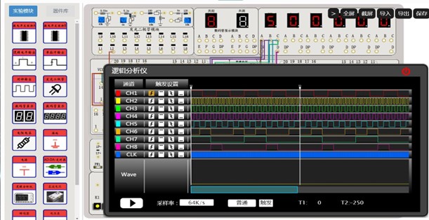 2、學(xué)生能在瀏覽器上拖放實(shí)驗(yàn)?zāi)K、實(shí)驗(yàn)芯片,搭建實(shí)驗(yàn)電路,選擇測試點(diǎn),實(shí)時(shí)信號采集,虛擬儀器(邏輯分析儀、示波器、邏輯筆、數(shù)碼管等)顯示實(shí)驗(yàn)結(jié)果;