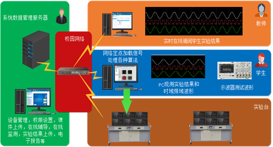 互聯(lián)網(wǎng)+無線通信系統(tǒng)實驗平臺主要有三部分組成:無線通信系統(tǒng)綜合實驗平臺、在線實驗網(wǎng)管平臺、在線實驗操作平臺。