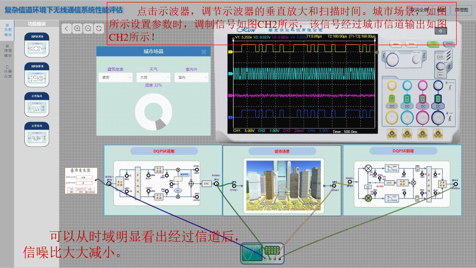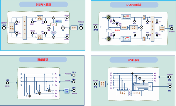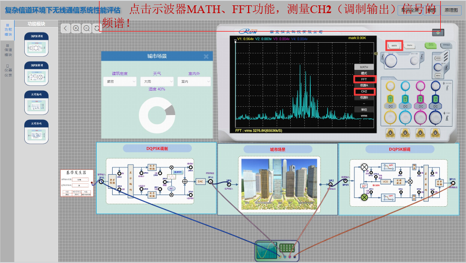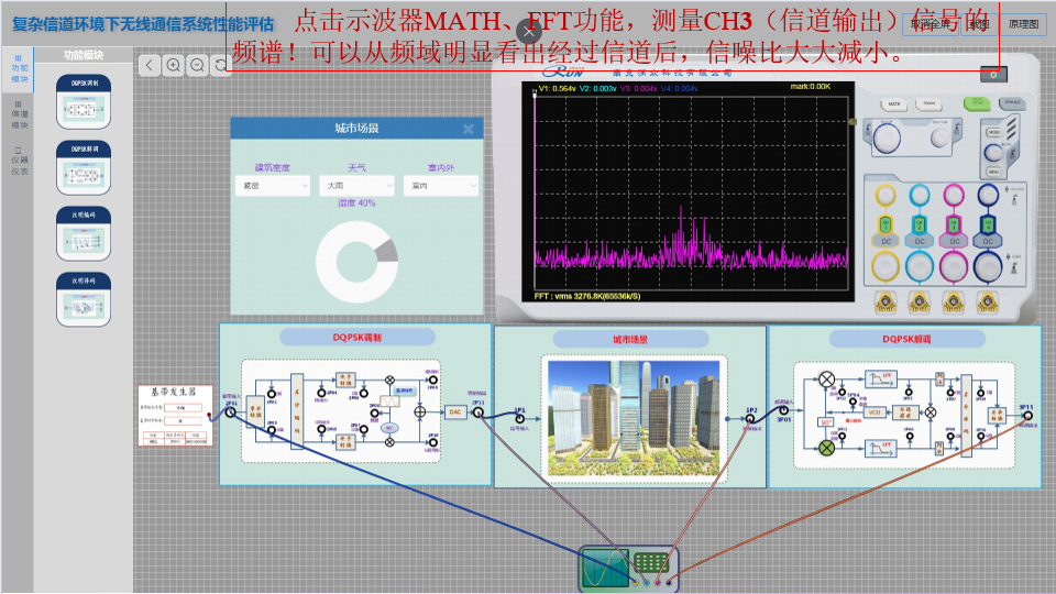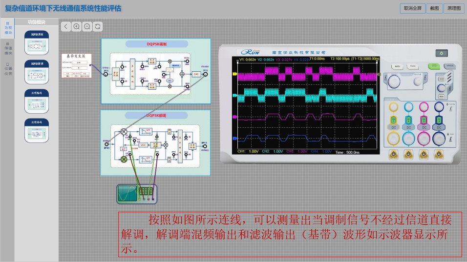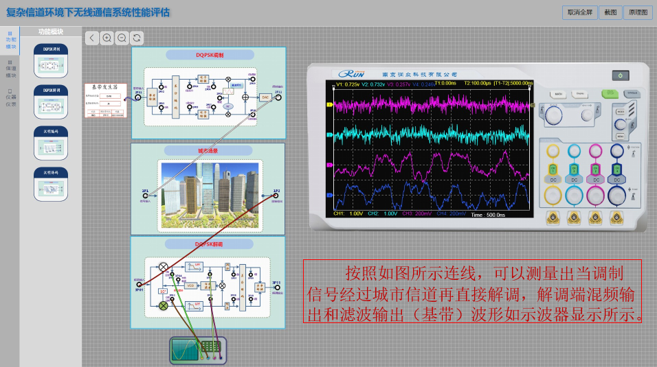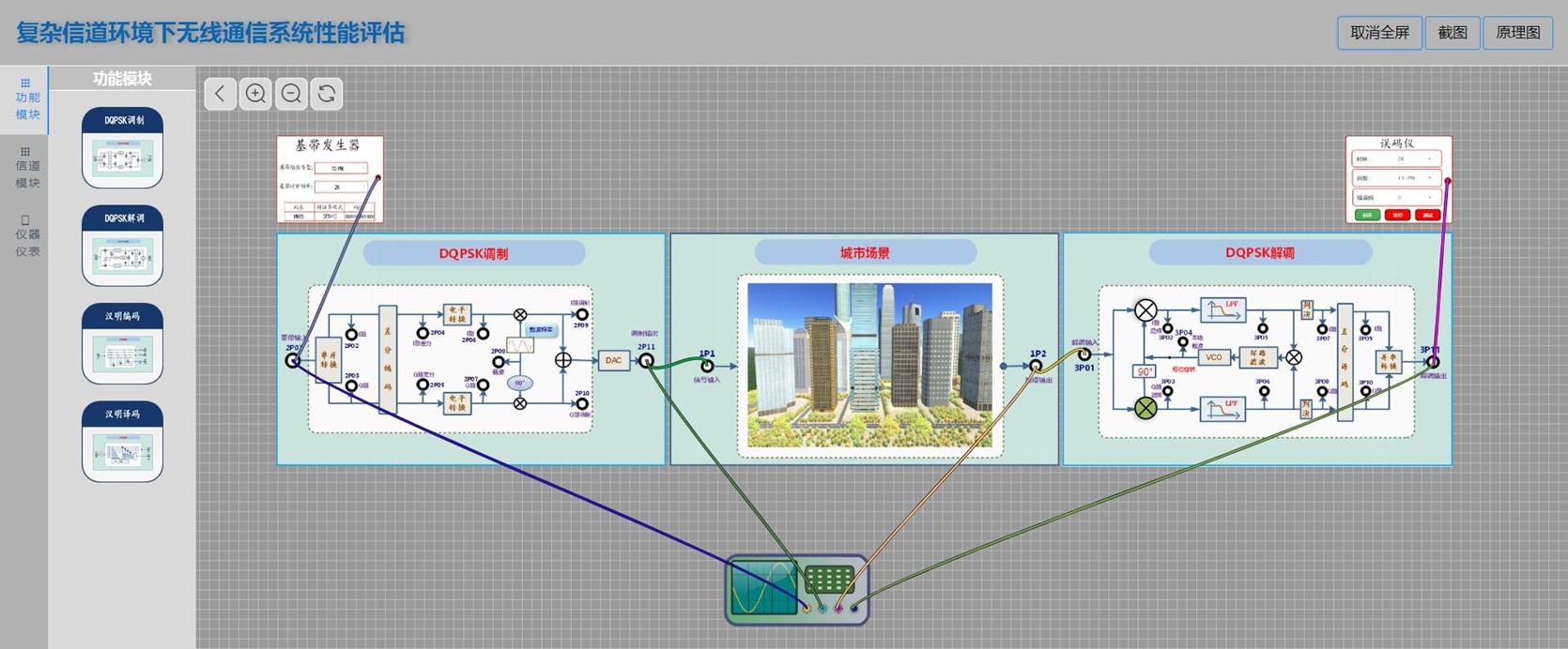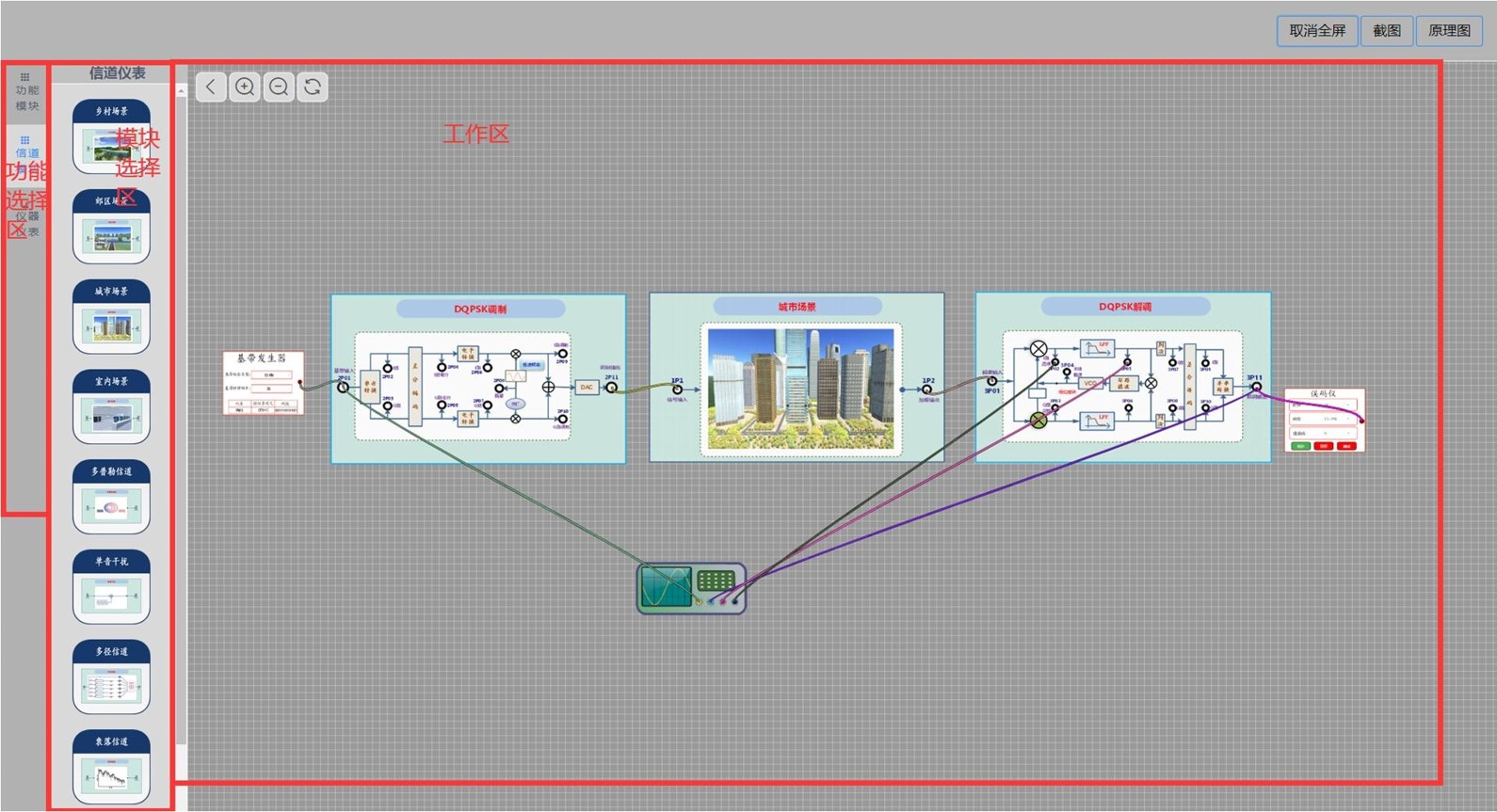 實(shí)驗(yàn)界面左側(cè)的功能選擇區(qū)可以選擇拖放的模塊種類,如功能模塊、信道模塊、儀器模塊。功能模塊有QPSK調(diào)制單元、QPSK解調(diào)單元、漢明編碼單元、漢明譯碼單元等。信道模塊有多徑信道、多普勒信道、衰落信道、高斯信道、單音干擾信道、城市信道、郊區(qū)信道、農(nóng)村信道、室內(nèi)信道。儀器模塊有基帶發(fā)生器、誤碼儀、示波器等。